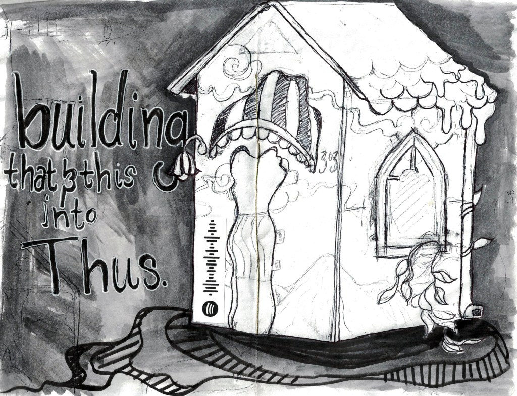 We build this home (and this friendship in one another) in response to the ostracizing of neurodivergence that has tinged Ernie, and a lifetime of poverty and homelessness with which I struggle. Together we make a full person, where we dole out the love once denied one another and construct safety and understanding together: Building thatandthis into Thus.