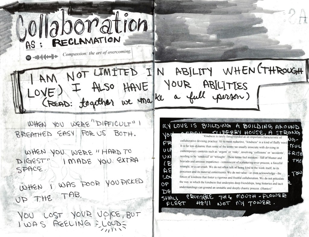 What is a project without a community to hold it? What is all this dancing and screaming for if we dance and scream into a void. Collaboration through its focus on togetherness can invite a community around its making as much as it existing.