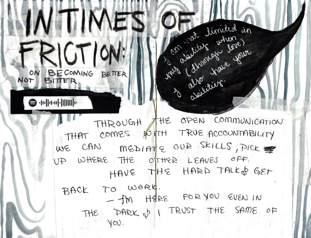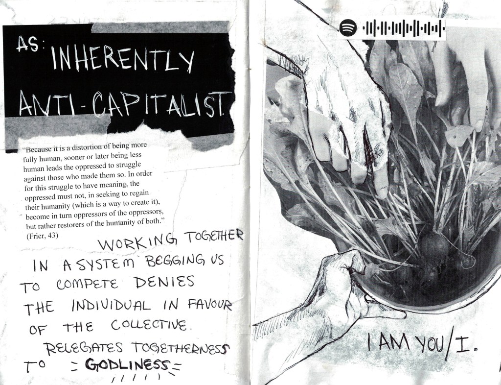 Collaboration rises above the greed that dwells within us all and sees others as a point of safety and care. It is inherently anti capitalist for me to offer myself and my skills to you in exchange for nothing but your willingness to do the same.