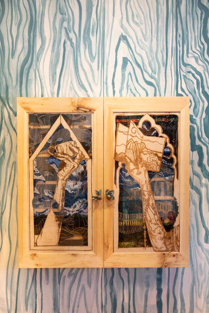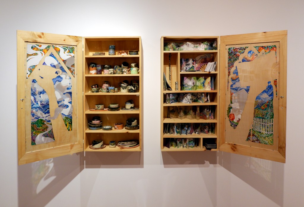 Two 24 X 48″ cabinets, recycled knotty pine cabinets, laser etched plywood, laser cut acrylic sheets, vitrail paints, handmade ceramics (given away and borrowed back for showing as part of community practice), handmade recycled paper accordion books, bronze cast knobs. 2022