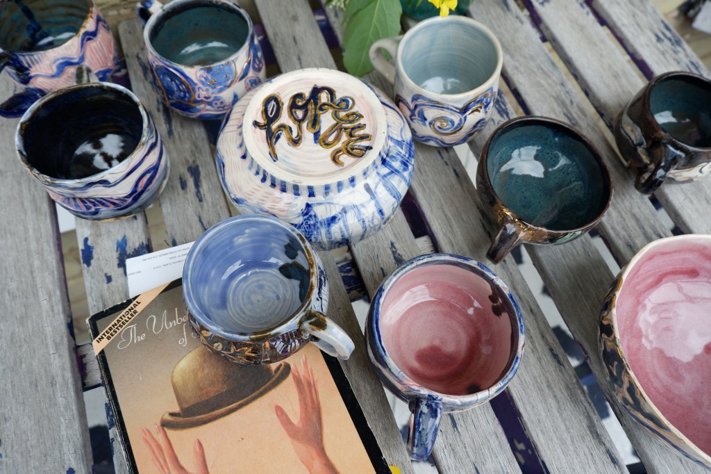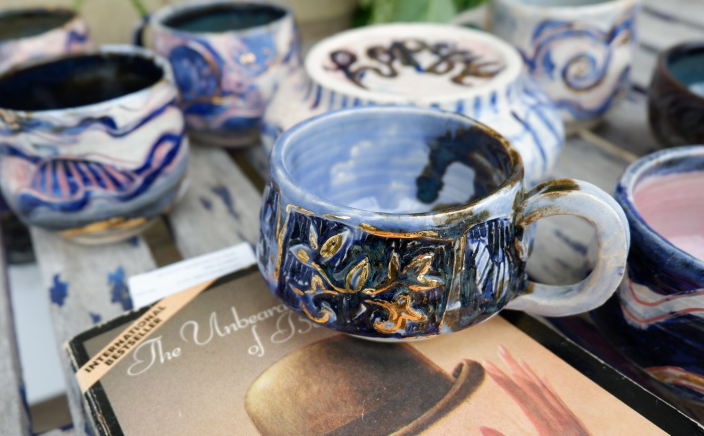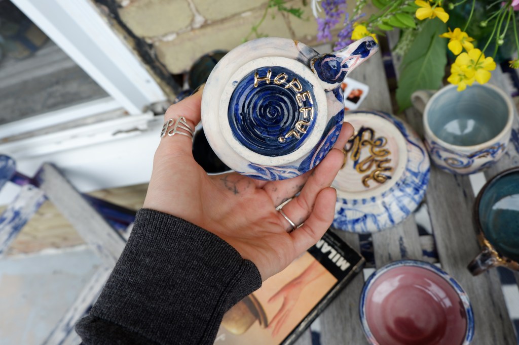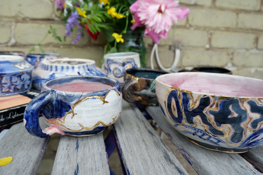 Wheel thrown stoneware clay, cooperative glazes, delftware blue stain experimentations. 2023