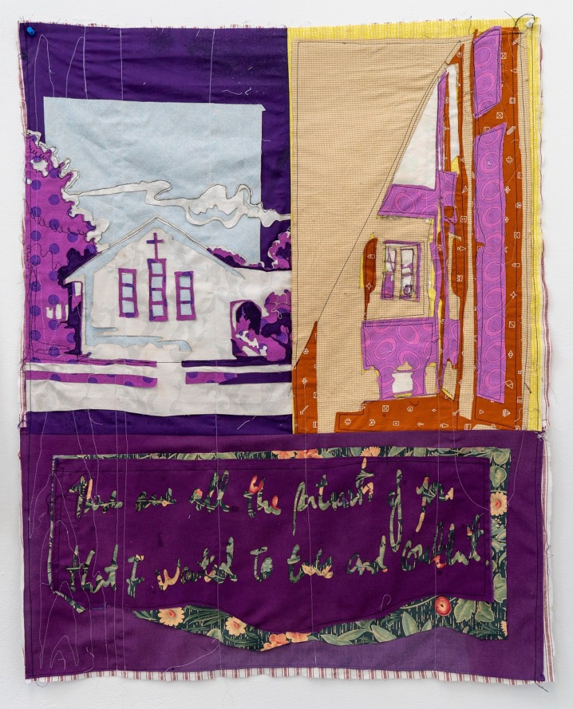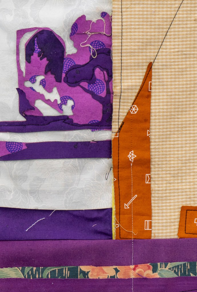 found vintage textiles, laser cut applique quilt blocks, free motion quilting techniques, 3ft X 4ft,2023