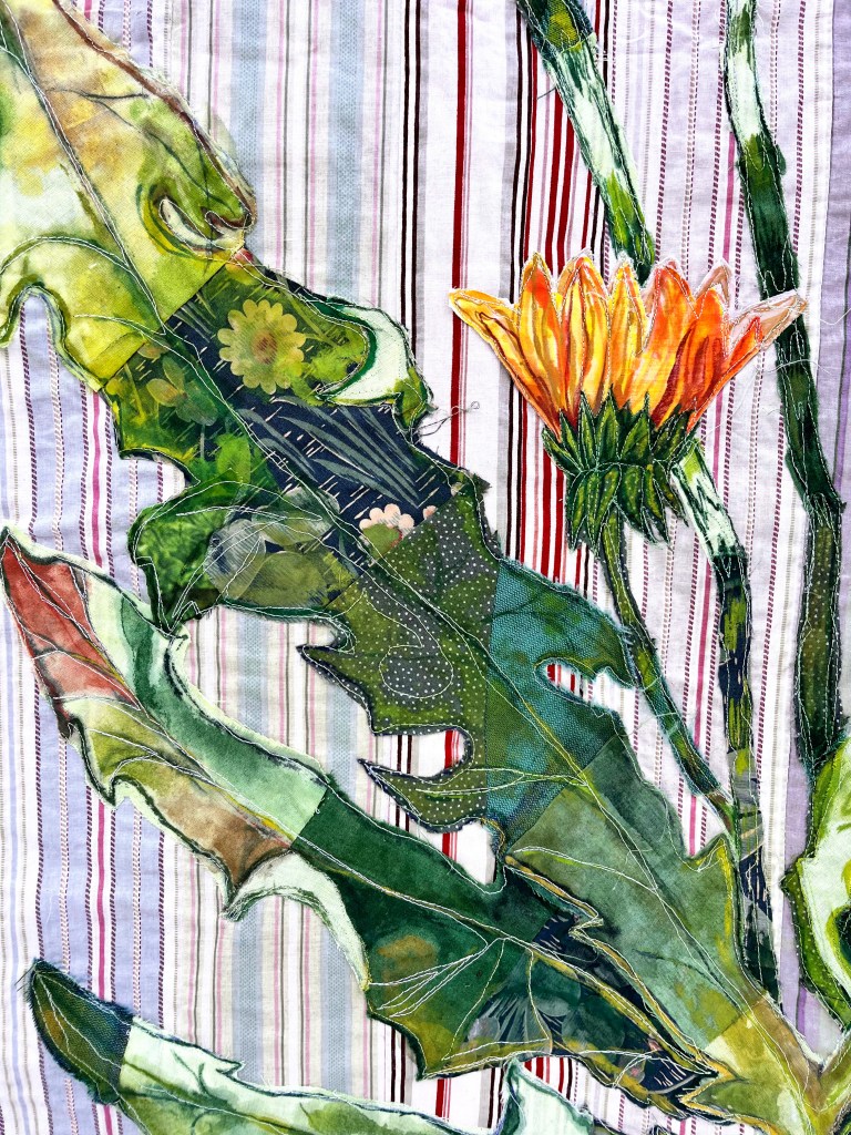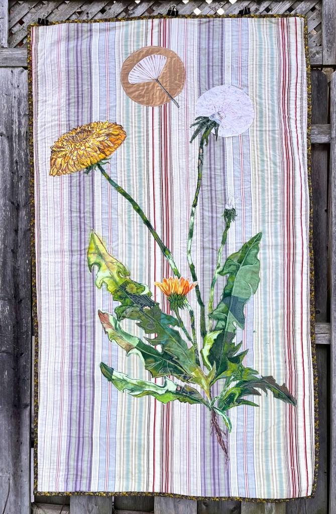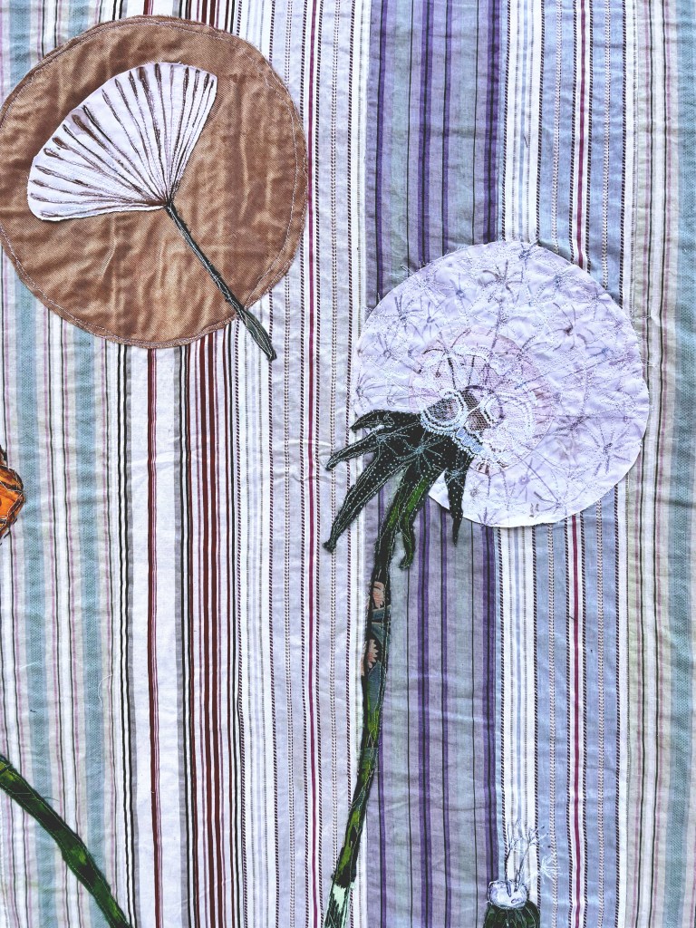 Free motion quilted second hand and found textiles, applique, ink, ballpoint pen. 36” X 72”, 2024