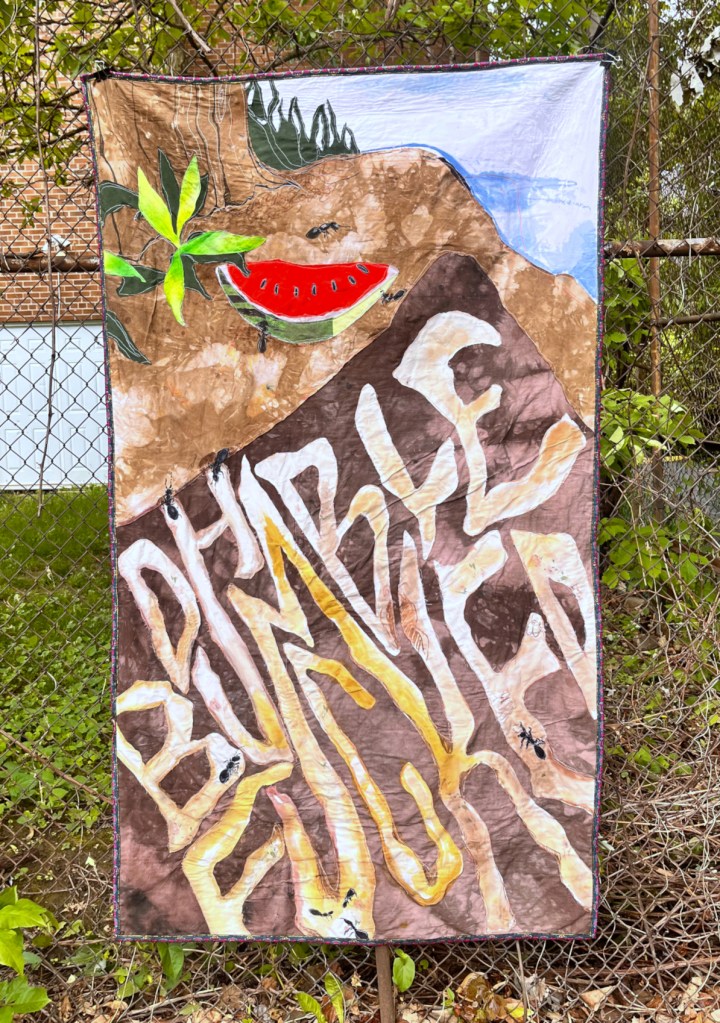 BACKSIDE. 2024, 38” x 74”, quilted second-hand and found textiles, cyanotype, applique, ink, ballpoint pen.
